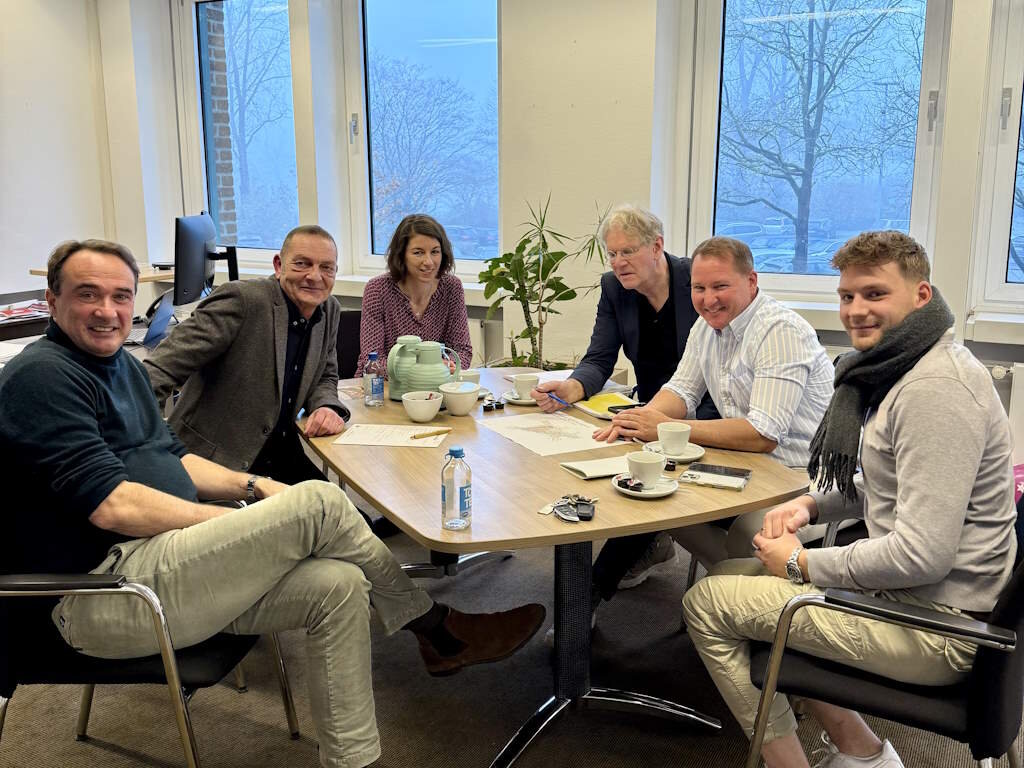 Am Dienstag trafen sich Architekt Stefan Bracht vom Planungsbüro SAL, Hanna Schwietert aus dem Fachdienst Stadtplanung und Bauordnung, Technischer Beigeordneter Hans Schröder, Leon und Lars Fischer, Betreiber des Cafés 'Zum Schuster' sowie Bürgermeister Christian Franke zur Abstimmung weiterer Planungsschritte im Steinfurter Rathaus.