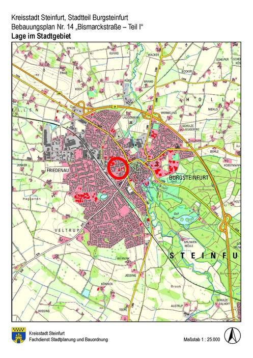 Der Entwurf des Bebauungsplanes Nr. 14 "Bismarckstraße - Teil I" der Kreisstadt Steinfurt liegt gemäß § 13a (2) Nr. 1 Baugesetzbuch (BauGB) nebst Begründung sowie den wesentlichen, bereits vorliegenden umweltbezogenen Informationen in der Zeit vom 16.09.2022 bis zum 24.10.2022 zur Einsichtnahme und zur Unterrichtung über die allgemeinen Ziele und Zwecke der Planung sowie die voraussichtlichen Auswirkungen für die betroffenen Bürgerinnen und Bürger, aber auch für Kinder und Jugendliche, öffentlich aus.