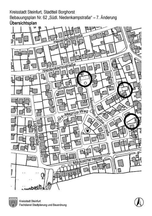 Der 7. Änderungsentwurf des Bebauungsplanes Nr. 62 "südlich Niedenkampstraße" der Kreisstadt Steinfurt liegt gemäß § 13a (2) Nr. 1 i.V.m. § 13 Baugesetzbuch (BauGB) nebst Begründung sowie den wesentlichen, bereits vorliegenden umweltbezogenen Informationen in der Zeit vom 29.04.2022 bis zum 30.05.2022 zur Einsichtnahme und zur Unterrichtung über die allgemeinen Ziele und Zwecke der Planung sowie die voraussichtlichen Auswirkungen für die betroffenen Bürgerinnen und Bürger, aber auch für Kinder und Jugendliche, öffentlich aus.