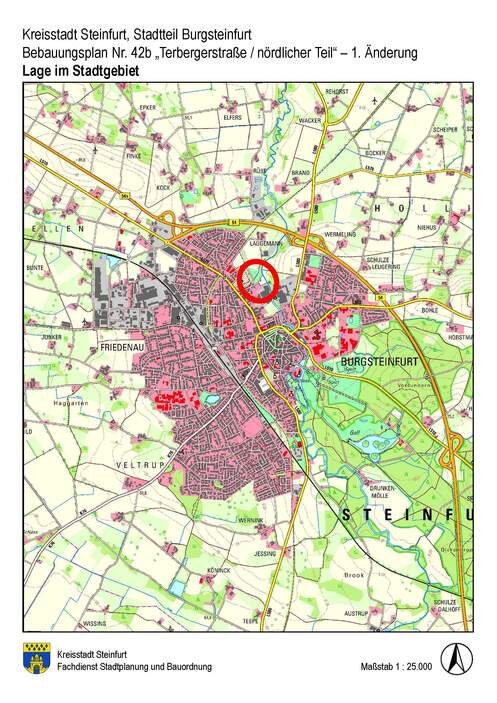 Der 1. Änderungsentwurf des Bebauungsplanes Nr. 42b "Terberger Straße / nördlicher Teil" der Kreisstadt Steinfurt liegt gemäß § 13a (2) Nr. 1 Baugesetzbuch (BauGB) nebst Begründung sowie den wesentlichen, bereits vorliegenden umweltbezogenen Informationen in der Zeit vom 16.09.2022 bis zum 24.10.2022 zur Einsichtnahme und zur Unterrichtung über die allgemeinen Ziele und Zwecke der Planung sowie die voraussichtlichen Auswirkungen für die betroffenen Bürgerinnen und Bürger, aber auch für Kinder und Jugendliche, öffentlich aus.
